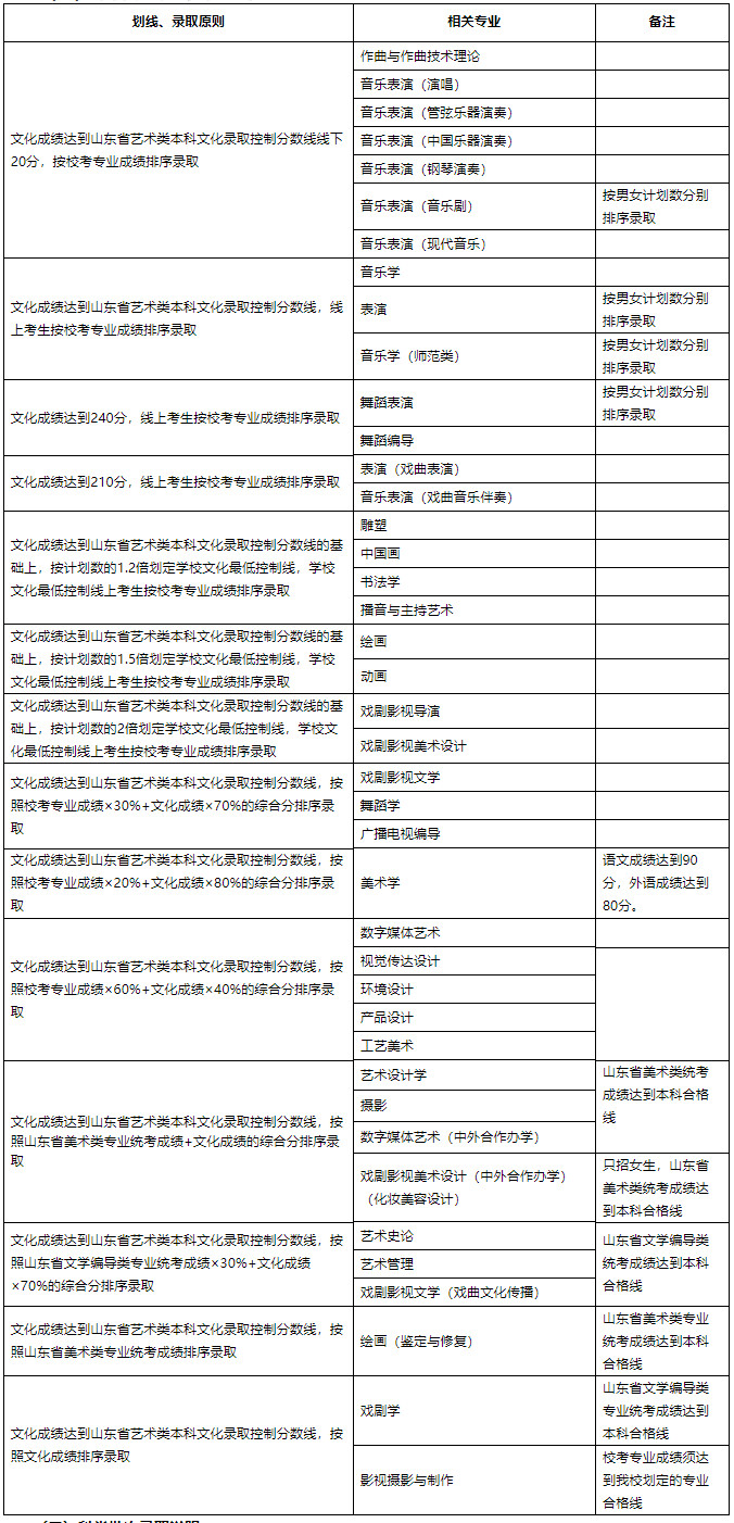 按照教育部及山东省有关规定,我校为独立设置的本科艺术院校,可自行划定文化录取控制分数线。