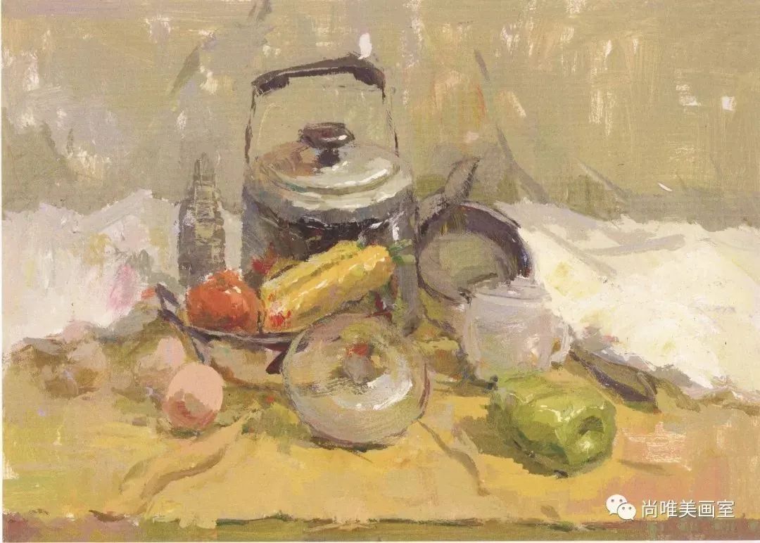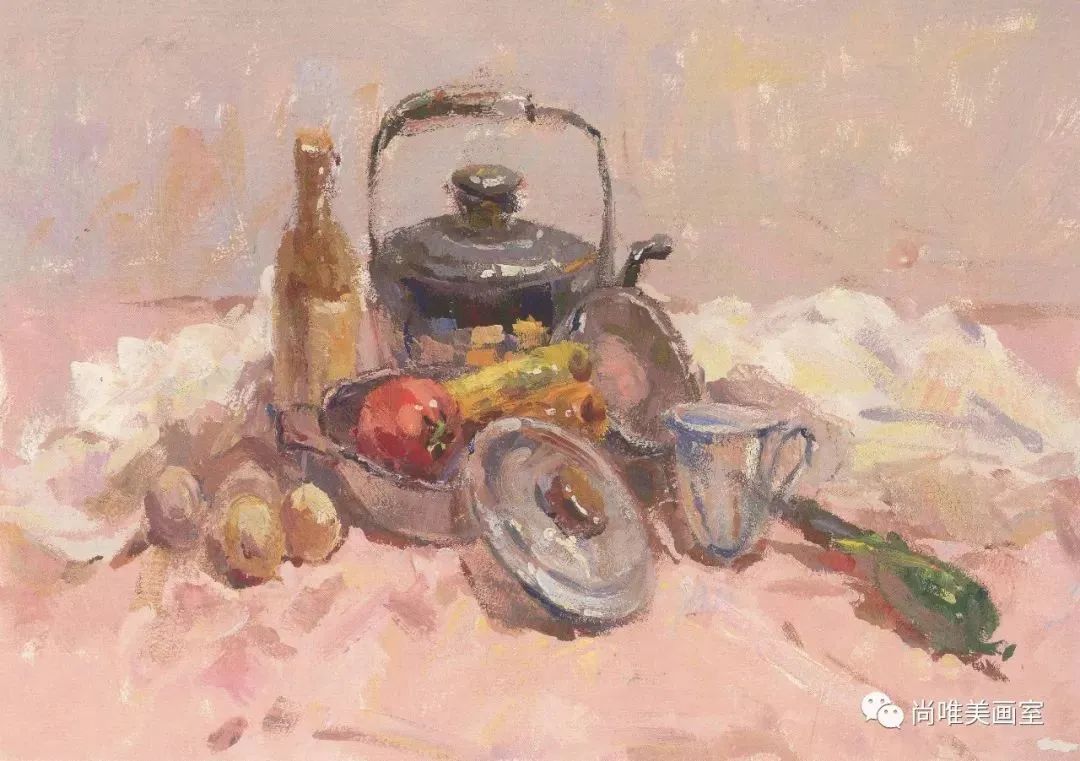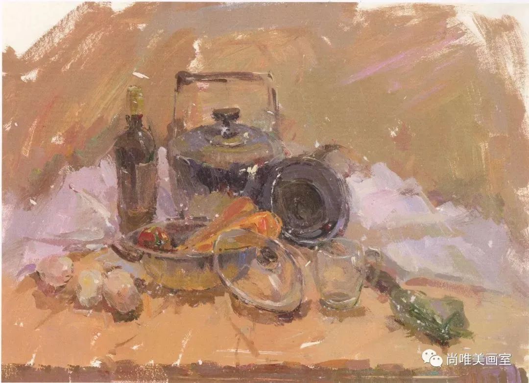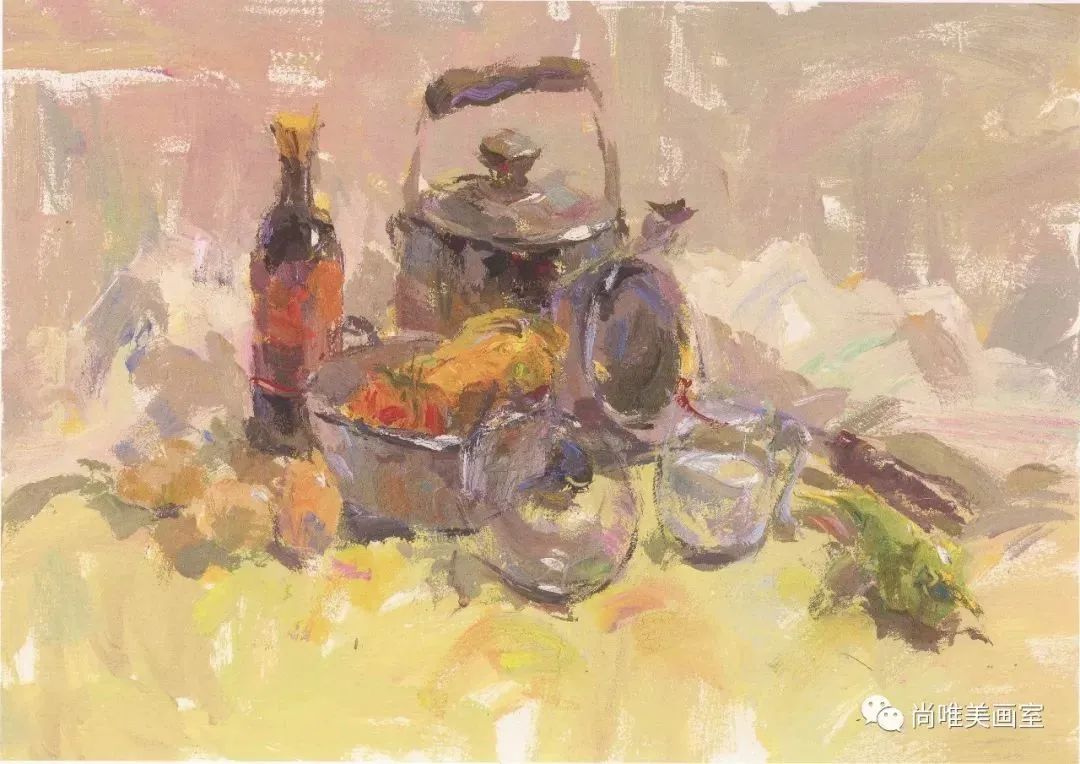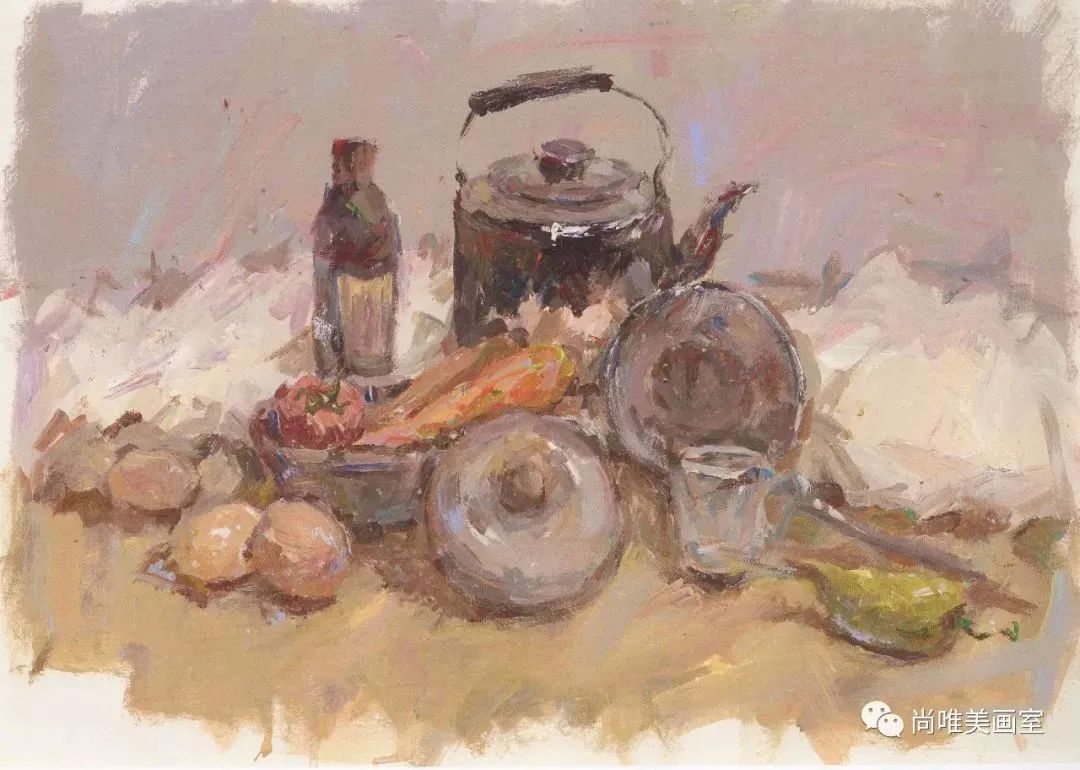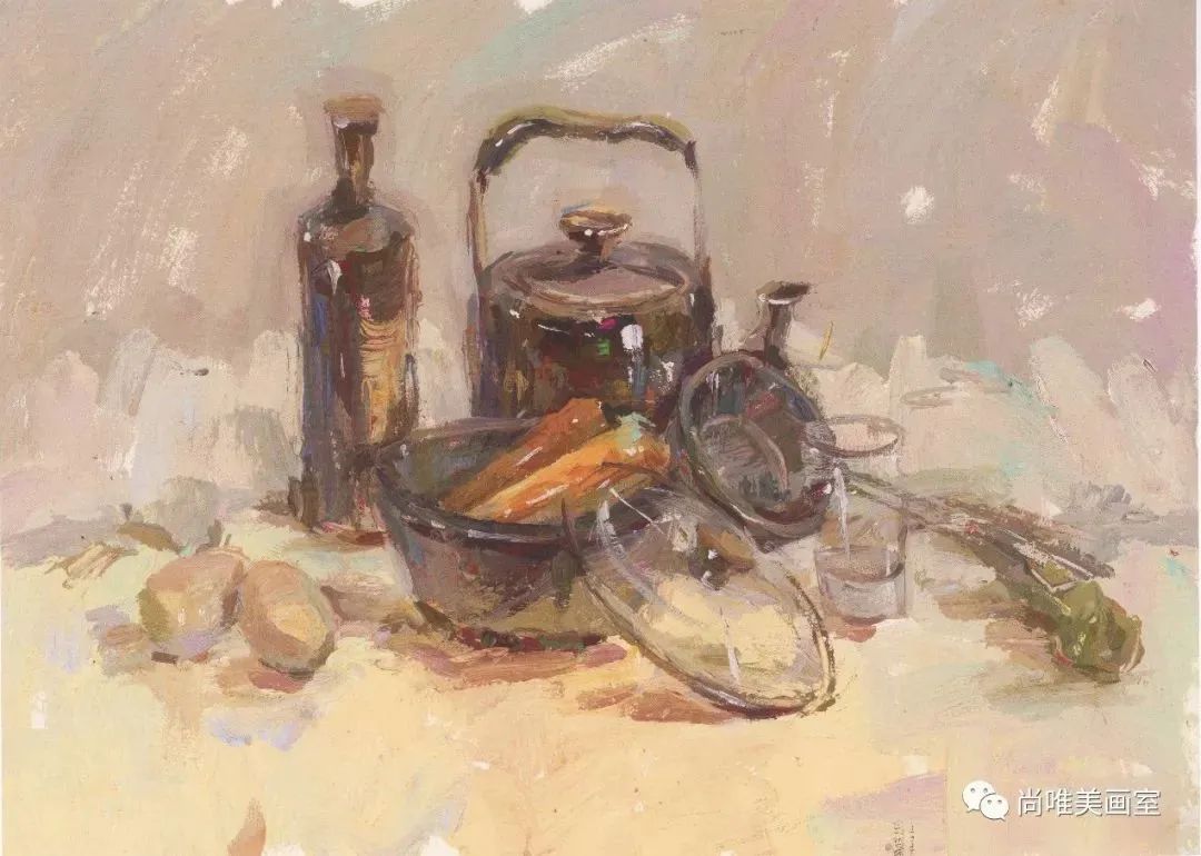 色彩:黑白照片静物组合默写,不锈钢水壶、单柄和双柄不锈钢锅、锅盖、胡萝卜、番茄、鸡蛋、玻璃杯、衬布、酒瓶等