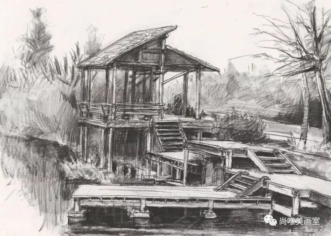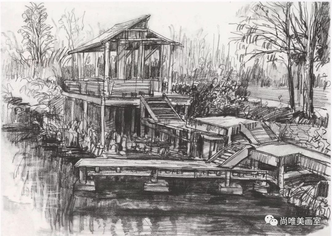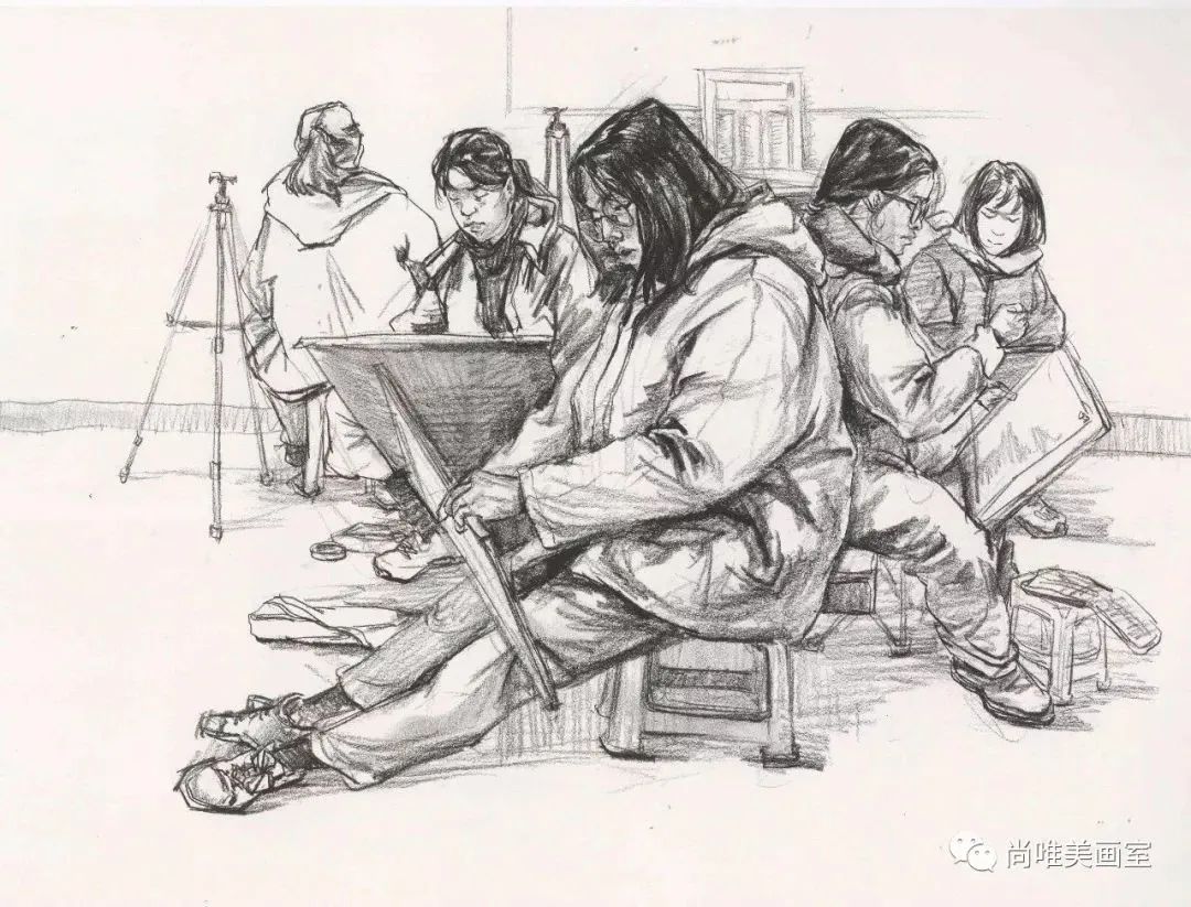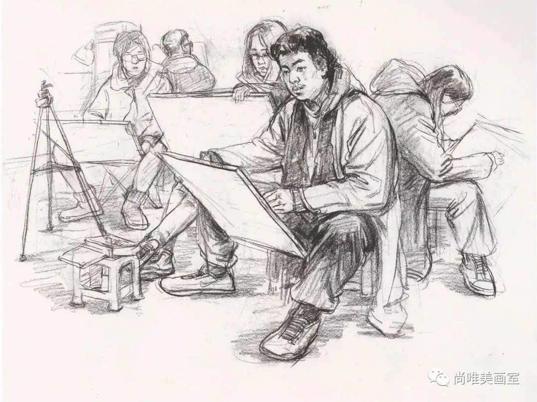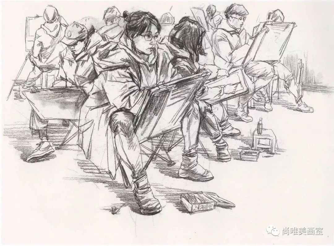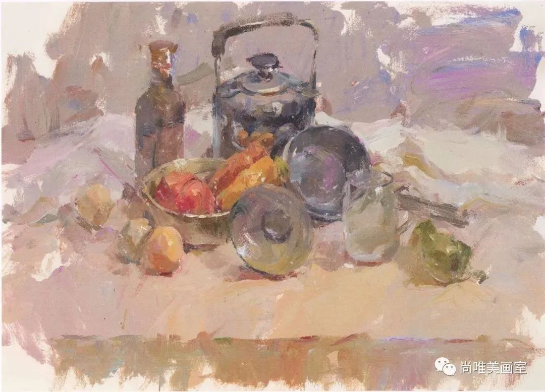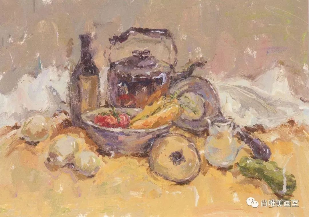 色彩:黑白照片静物组合默写,不锈钢水壶、单柄和双柄不锈钢锅、锅盖、胡萝卜、番茄、鸡蛋、玻璃杯、衬布、酒瓶等