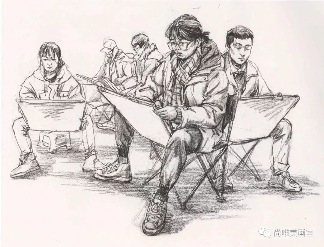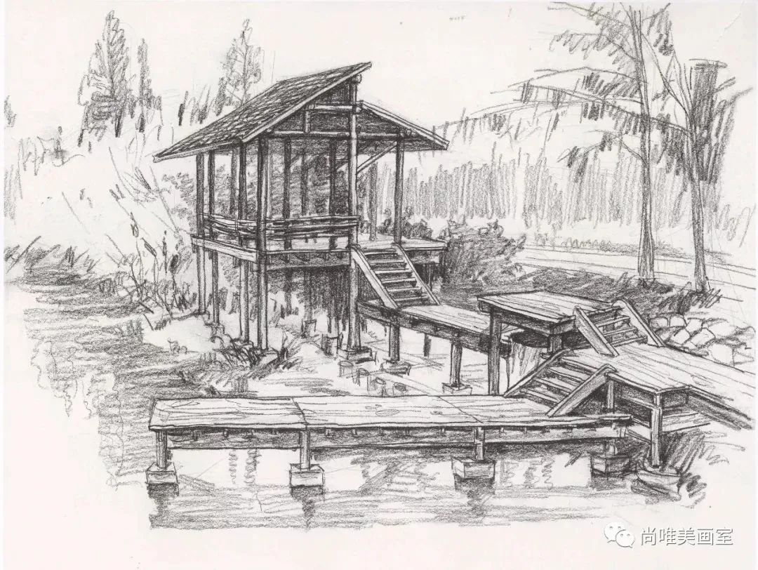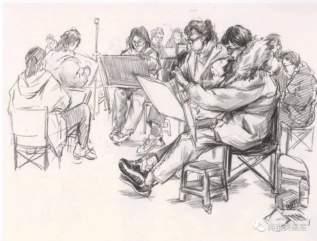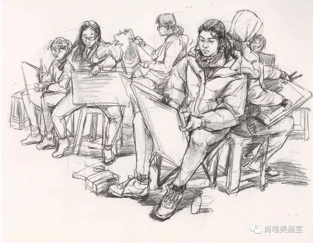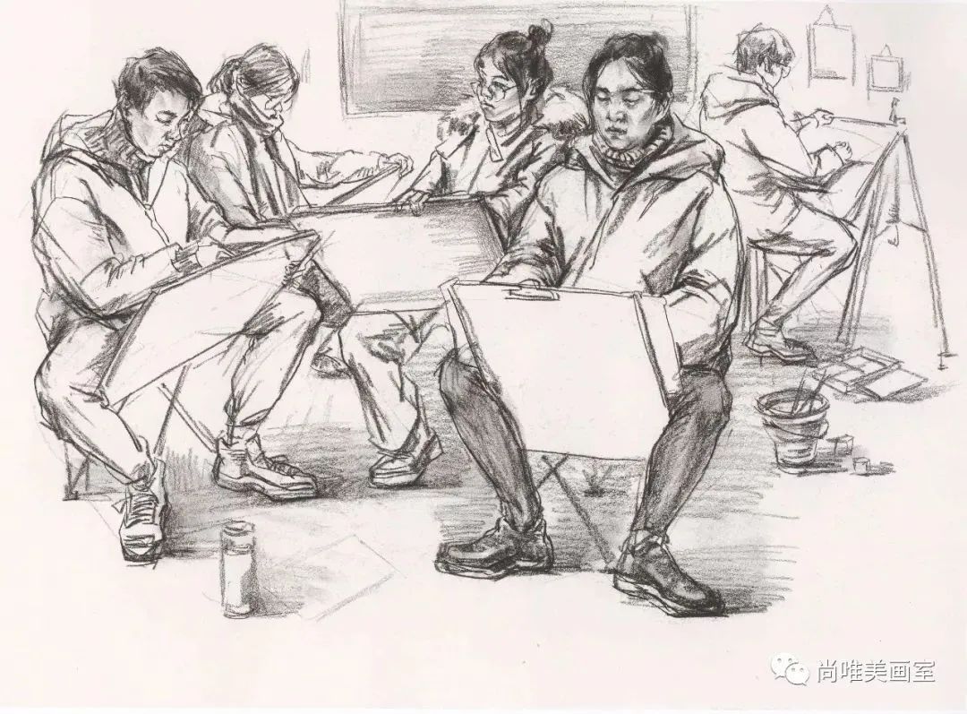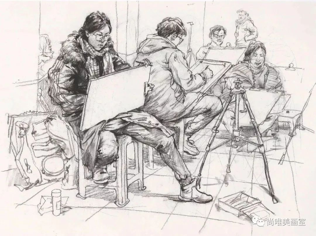色彩:黑白照片静物组合默写,不锈钢水壶、单柄和双柄不锈钢锅、锅盖、胡萝卜、番茄、鸡蛋、玻璃杯、衬布、酒瓶等