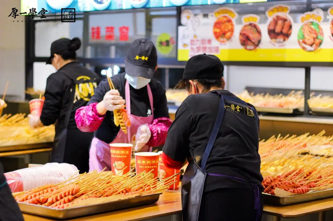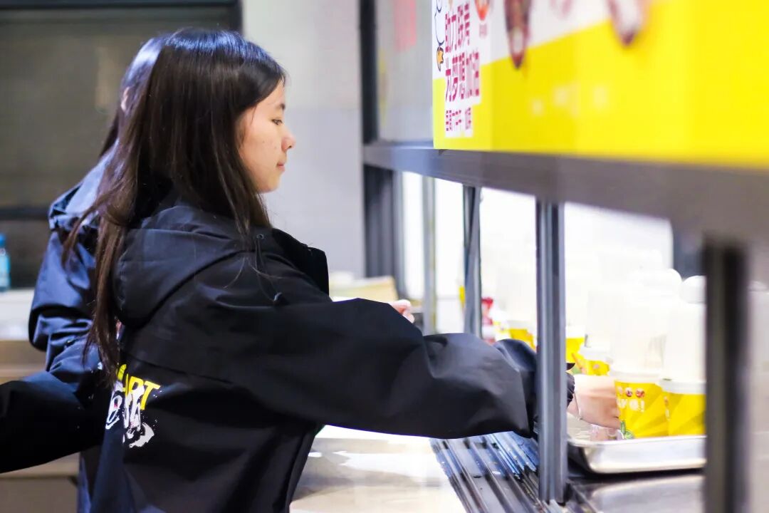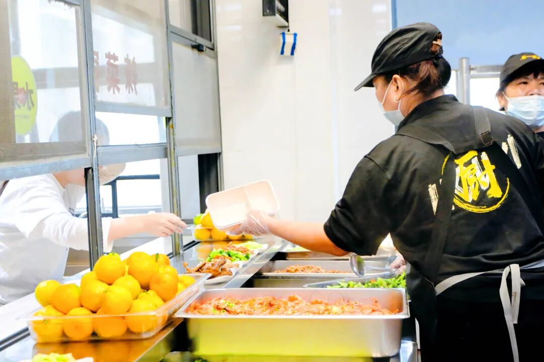 夜色渐深,食堂的喧嚣早已褪去,只剩下后厨一隅还亮着温暖的灯光。几位穿着黑色工作服、系着围裙的食堂阿姨,正围在长长的操作台前,开始一天中最后一项任务——打包夜宵。