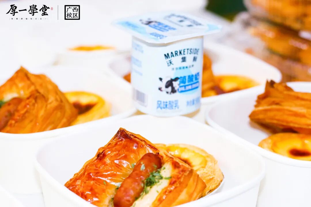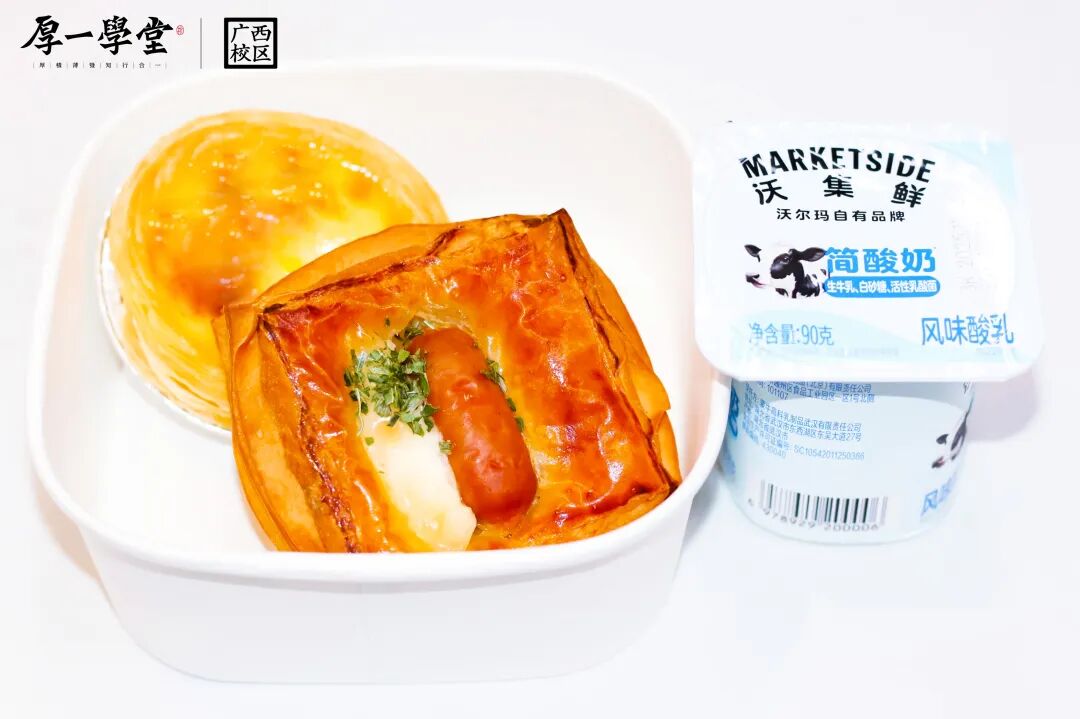 旁边卧着的香肠包,松软的面包体温柔地裹住一根油亮的香肠,表面撒着零星香草。咬下去,先是面包的绵甜,随即是香肠扎实的肉感,咸香滚烫的汁水瞬间充盈口腔。